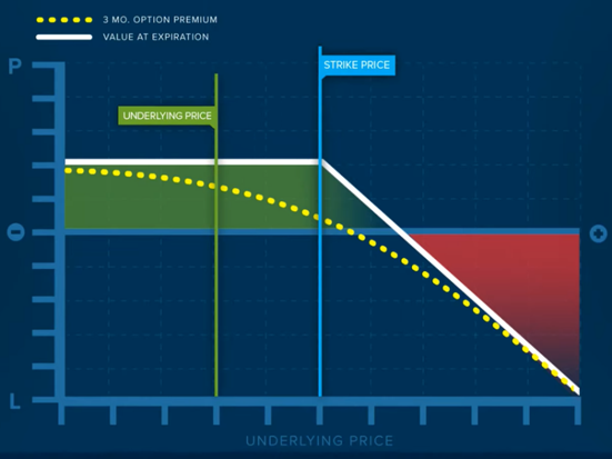 A covered put would be considered by someone who would like to derive additional income from a short stock position. A covered put allows the investor to hold a short equity position while simultaneously receiving the premium from selling an equal amount of put options against it. The covered put writer is bearish on the stock’s long-term potential but is willing to forego a stock’s downside below the strike during the life of the option in order to receive the proceeds of the put premium. It should be noted that the combined position has a similar profile to that of a short call. The covered put writer remains exposed to any upside in the underlying shares, meaning his loss potential is unlimited.