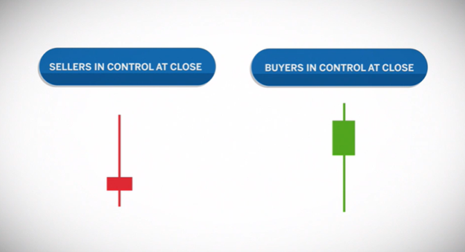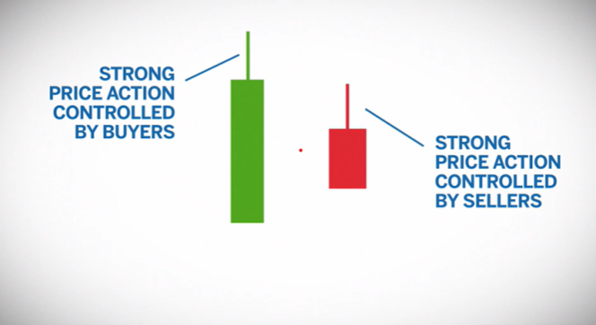 • The size of the wick relative to the body is important in determining who was in control: whether it was buyers (green candle), sellers (red candle), or both.