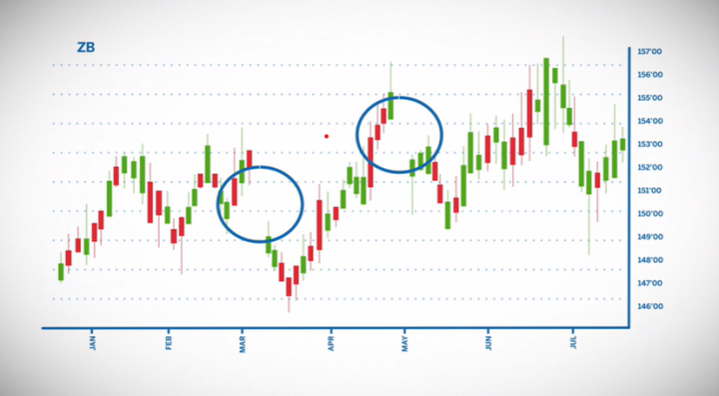 Candles that gap above or below the previous candle are an indication that there is momentum in the trend. For example, 30-Year Treasury Note futures (ZB) gapped down twice on this daily chart and continued to push down after the gap.