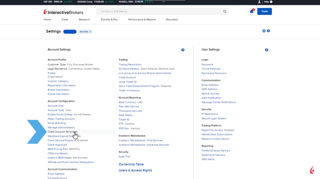 Template save time when several sending applications need to be completed in a timely manner. In the Client Account Templates, IBs can specify the account type, trading permissions and objectives. First, click the Head and shoulders icon and select Settings. Next, click on Client Account Templates to access the different templates available. Here by clicking the blue “I” icon or the Pencil edit icon the user can view and edit the templates accordingly.