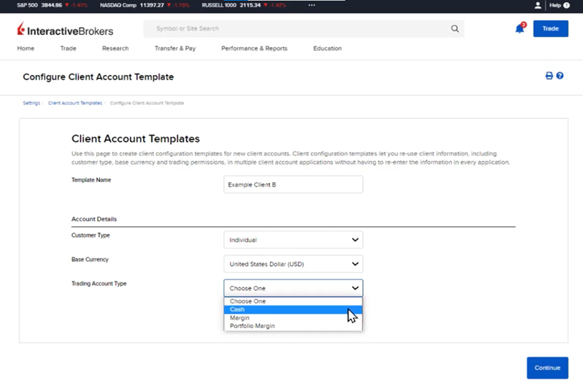 The Configure Client Fees page allows brokers to set their fee or markup schedule in the Account Template, choosing from manual invoicing, fee per trade unit, or interest rates. After configuring and reviewing, clicking Continue finalizes the template for application.