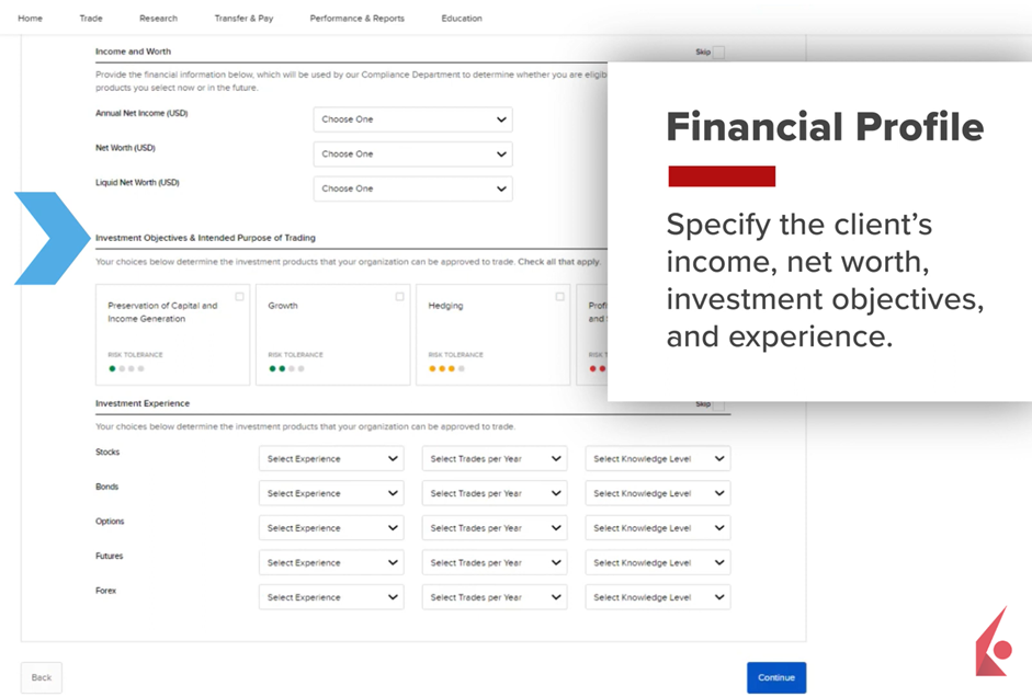 To continue with the client’s financial profile information, use the dropdown menu and select the proper amounts for Annual Net Income, Net Worth, and Liquid Net Worth. Some fields can be filled out later by checking the box located in the right side of the screen under the name “Skip”.