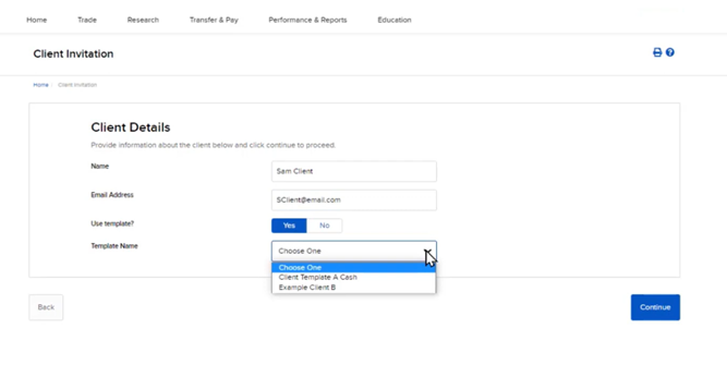 On the Home Dashboard, the broker can apply a pre-configured Client Account Template to an application invite by selecting Add Account, choosing a Fully Electronic application, entering the client’s details, selecting Yes for using a template, choosing the desired template from the drop-down menu, and then sending the invite after review. After clicking the Continue button a page is displayed to review the application and send it to the client’s email address.