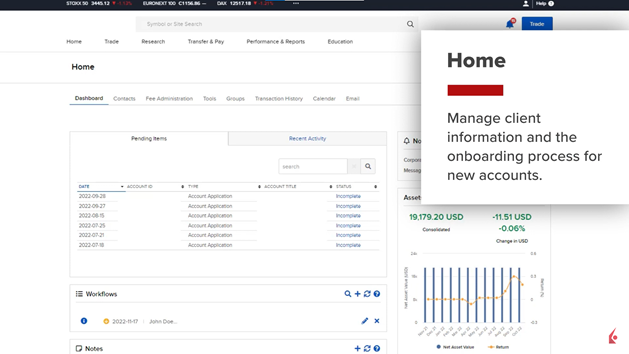 After logging in, the dashboard with specific client information will be displayed in the Home page to easily get information and onboarding process for new accounts. In this page, contacts, fee administration, tools, groups, transaction history, calendar ,a and email can be found.