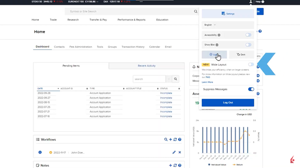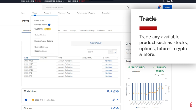 Next, in the Trade tab IBs can find available products such us stocks, options, futures, crypto, etc. Similarly, the research tab allows IBs to create watchlists and market scanners, access fundamentals explorer, and news. In the Transfer & Pay menu, deposit funds, transfer positions, monitor transaction status, etc. In the next section menu, Performance and Reports the IBs can find IBKR’s robust reporting features including PortfolioAnalyst. Finally, in the Education tab IBs can find educational resources including short videos, Trader’s Insight, and the IBKR Forum.