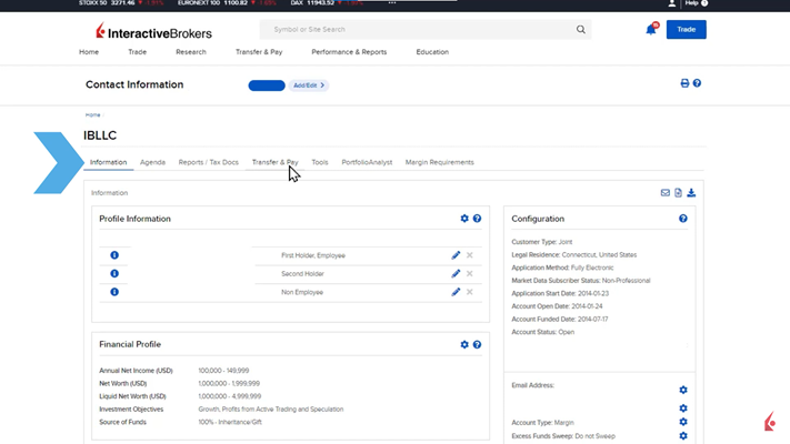 Opened, pending account, and prospective clients are displayed in the Contacts tab of the Home page. At the top on the Contacts page the Statistics Row can be seen. To view the information page, click the blue “i” icon to the left of the contact. Here IBs can access tools such as funding and position transfers, statements, PortfolioAnalysis reports and additional tools.