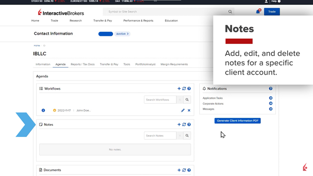 Next, on the Agenta tab IBs can access CRM tools like Workflow, Notes, Documents, and Events for the specific client account.