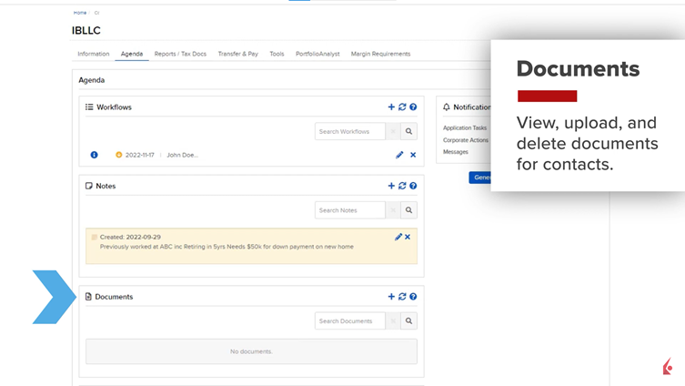 The Notes panel allows brokers to add, edit, and delete notes for a specific client account. To add a new note, click the plus sign in the upper right corner of the panel and enter the details in the Description field. This is useful for recording important client information, such as a client’s retirement plans or upcoming financial needs.
