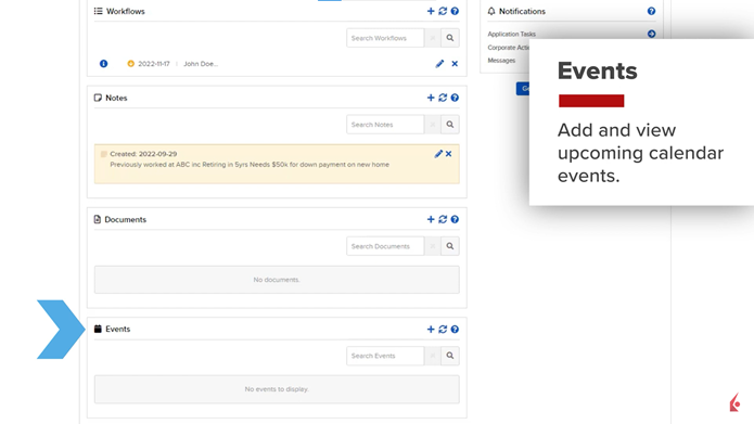 The Events panel is designed for adding and viewing upcoming events scheduled with the broker’s contacts. To add a new event, click the plus sign in the upper right corner, then enter the event name and start and end times, or indicate if it is an all-day event. Events can be edited by clicking the pencil icon and deleted by clicking the x icon and confirming the action.