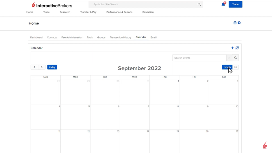 Brokers can view and manage events for all clients from the Calendar tab, accessible from the main Home page. This calendar offers both a monthly and daily list view, which can be toggled using buttons on the upper right. Brokers can add events directly from this page by clicking the plus sign in the upper right corner.