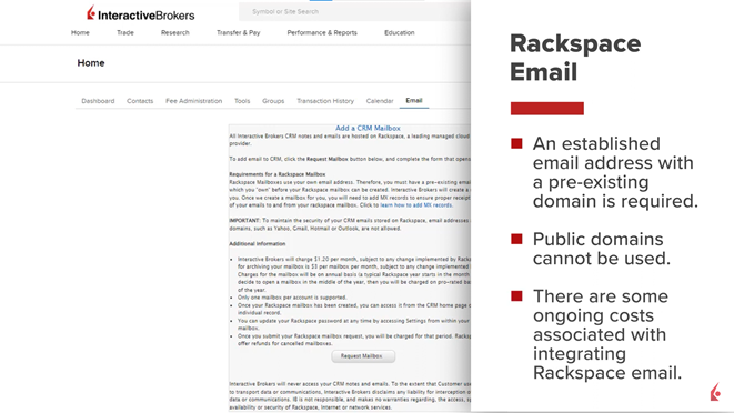 Adjacent to the Calendar tab is the Email tab, which partners with Rackspace for secure email storage. Interactive Brokers (IBKR) does not store or access these emails. To use this feature, users must request a mailbox through Rackspace, which requires an established email address from a private domain. Public domains like Yahoo or Gmail are not supported. There are ongoing costs for using Rackspace email integration.