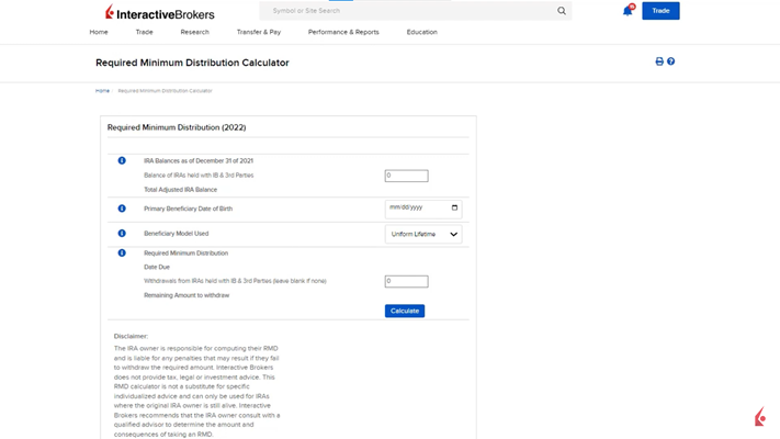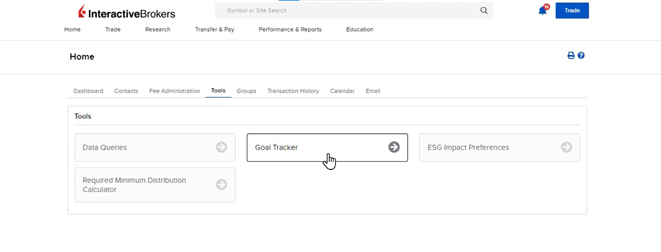The Tools tab includes features such as Client Data Queries, Goal Tracker, ESG Impact Preferences, and the Required Minimum Distribution (RMD) Calculator. Client Data Queries enable brokers to generate reports based on performance and other criteria. The Goal Tracker helps project portfolio performance against client goals. ESG Impact Preferences allow clients to define socially responsible investment criteria. The RMD Calculator aids in calculating required distributions for IRAs, though IBKR does not provide tax or legal advice.