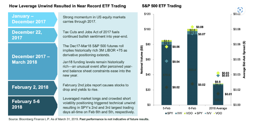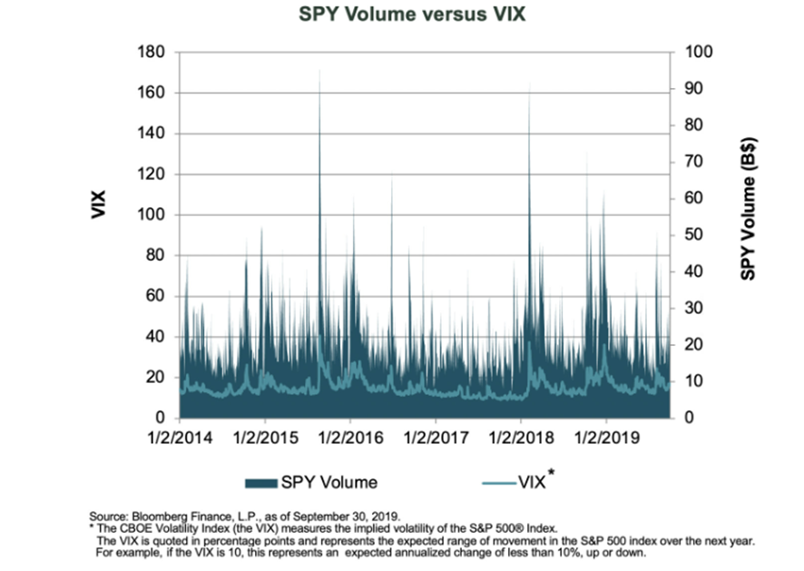 Market volatility spiked in the fourth quarter of 2018 as concerns over slowing global growth, tightening monetary policy and escalating trade wars sparked a sharp sell-off in the market. During this time period, SPY spreads remained at constant levels.