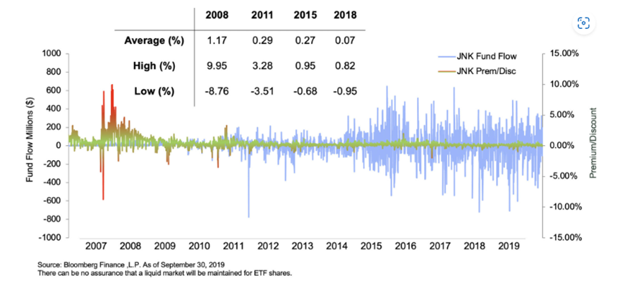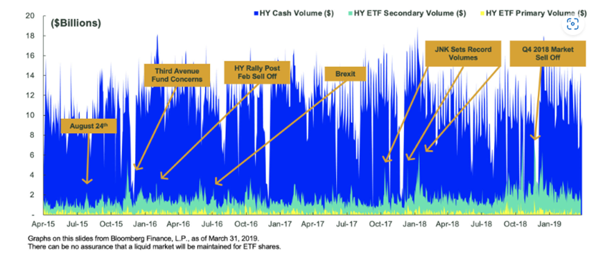 - During periods of high volatility, high-yield ETF primary market activity is only a small percentage of total high-yield spot bond trading
