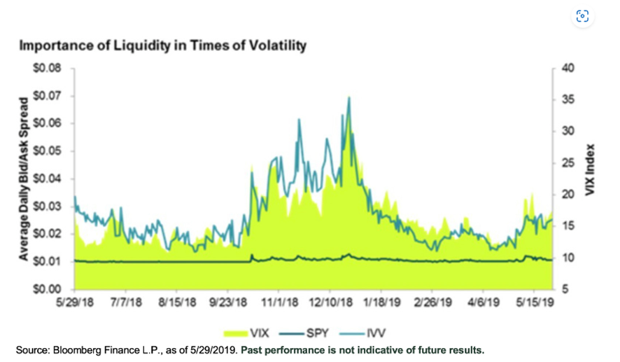 An ETF Liquidity Comparison: In the fourth quarter of 2018, the iShares Core S&P 500 ETF (IVV) saw spreads widen with higher volatility. Meanwhile, SPY maintained consistent spreads, allowing investors to pivot in either direction with the same trading costs.
