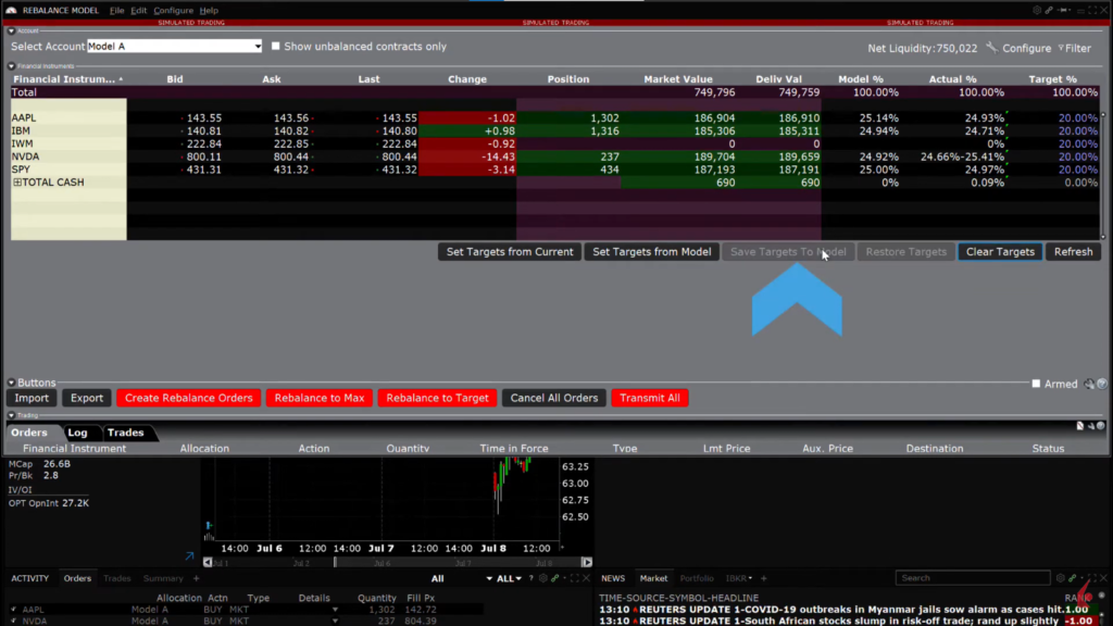 Model portfolios also offer the possibility to add and remove stocks, options, and having an additional client invest into the model. For example, adding an extra stock in the portfolio previously created can be done as follows in the Rebalance Model screen. The rebalance button can be found in the far-right side of the screen. Click under SPY in the Financial Instrument column and add IWM. Then allocate the right percentage and make sure that the Target % comes back to its original 100%. Finally, click on the Save Target to Model.