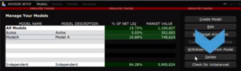 To completely divest a Model, you need to first adjust all Target percentages to 0% within the Rebalance Model Screen. After saving these changes, initiate a Rebalance to Target, confirming the adjustments in orders before transmitting them. Once the orders are executed, all Positions should be closed, leaving the Model with 100% cash. Exit the Rebalance Model screen, navigate back to the Advisor Setup, and delete the Model. This action moves the cash back into the independent area, making it available for other investments. The same steps can be taken with different types of assets such as Options, Futures, or Bonds.