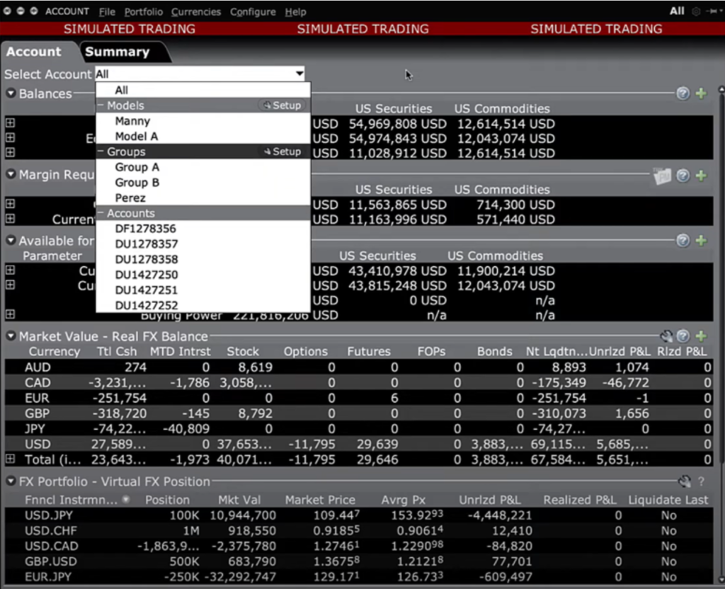 In the Market Value area below, the tab displays cash positions and the real-time value of open positions across various asset classes, along with the unrealized profit and loss (P&L) for each account. Additionally, the Portfolio tab offers numerous customizable fields and information to simplify an Advisor’s tasks. Advisors are reminded to use the shortcut button to the Account window for quick access to clients’ buying power and available balances.