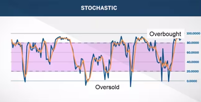 • Stochastics: a reading over 80 is considered over-bought and a reading below 20 is considered over-sold. This means the stock is trading either near the top of its range or near the bottom of its range.
