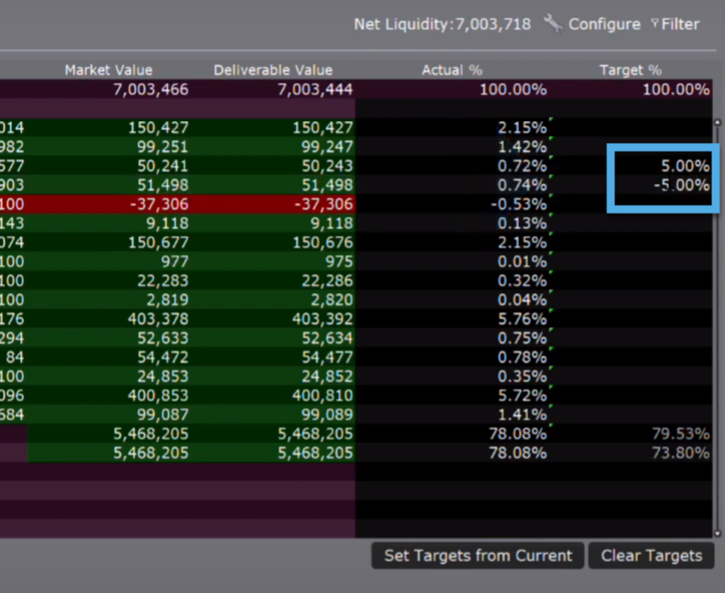 On the Rebalance Portfolio screen, you can set the Target % to match the current Actual % values by clicking the “Set Target from Current” button at the bottom for all instruments, or by right-clicking on the Target % box of an individual instrument. To clear the Target % values, click the “Clear Targets” button at the bottom right. You can manually enter new Target % values in the desired rows, with positive percentages indicating long positions and negative percentages indicating short positions.