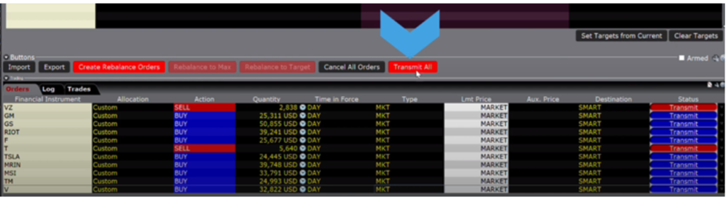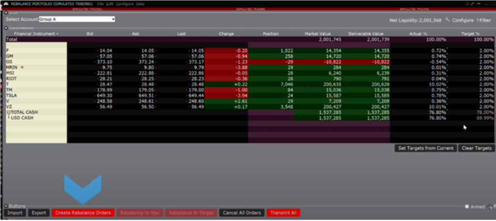 Portfolios can be exported or imported using the buttons in the lower left-hand corner. To adjust all stock Target % for Group A to 2%, select Group A from the account drop-down box, then change each Target % in the column to 2%. The Total Cash Target % will adjust accordingly. Once satisfied with the Target % weights, click the red “Create Rebalance Orders” button to open the trading window.