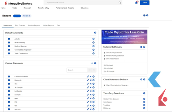 A full suite of reporting software for IBs is offered by Interactive Brokers to get standard statements, create custom reports, enable automatic statement delivery, and access to IBKR’s PortfolioAnalyst. These reporting features can be accessed from the Performance and Reports menu in the Broker Portal.