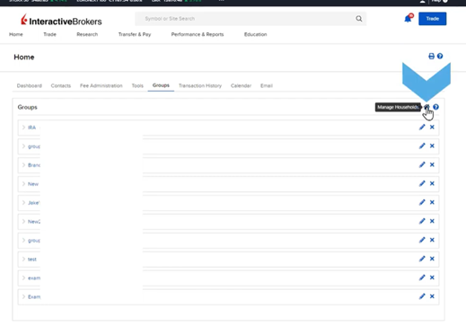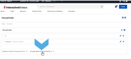 Brokers can create Households for eligible accounts, where a head of household can view all accounts’ reports and details. Accounts remain separate but linked for reporting purposes. Manage households via the Manage Households button. To add a household, click the plus sign, name the household, and add accounts. Submit electronically, then complete the Establish Head of Household form or the Change Head of Household form for changes.