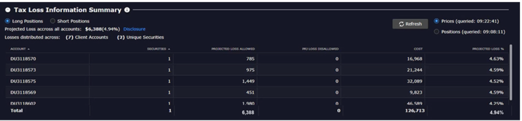 In order to view a summary of projected losses and tax loss harvesting opportunities in the tool, click on the “Tax Loss Information Summary” section to get a detailed look of possible areas of improvement.