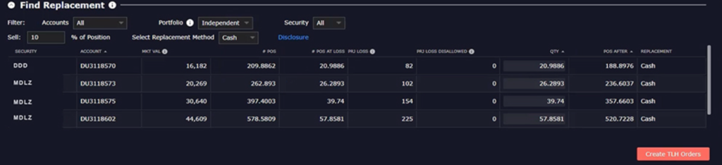 The find replacement section can help Advisors locate opportunities filtering by account, portfolio, or individual security. After that, the advisor can select the percentage of the position to close and for long positions the following replacement methods are available: cash, ETF, and scanner.